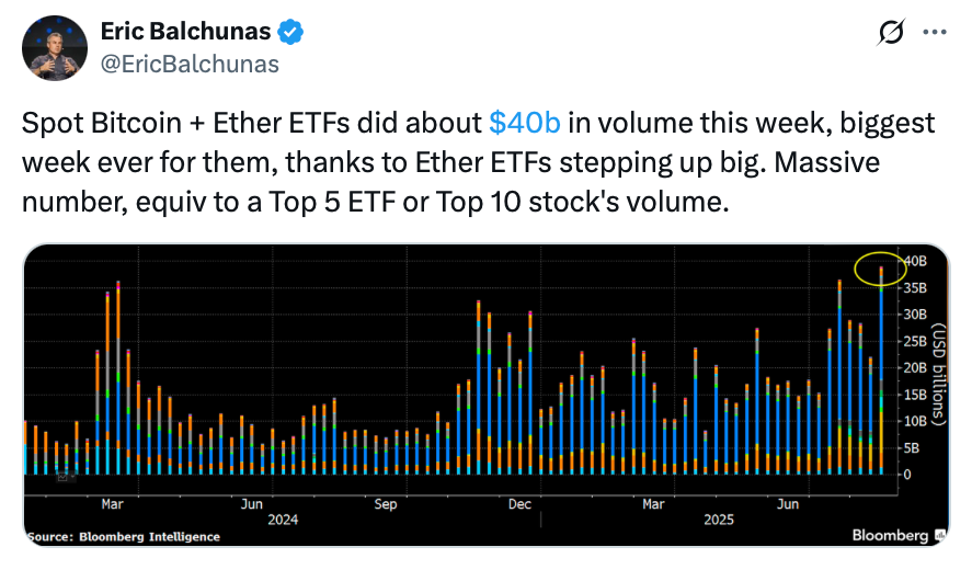 Laut ETF-Analyst Eric Balchunas war es „die größte Woche aller Zeiten“ für diese Fonds. In einem Beitrag auf X betonte er die Rolle von Ethereum: „Ether-ETFs lagen elf Monate lang im Schlaf, wurden aber im Juli plötzlich wach.“ Allein in der vergangenen Woche war das Handelsvolumen der Ethereum-ETFs für 17 Milliarden US-Dollar gut, ein neuer Rekord.