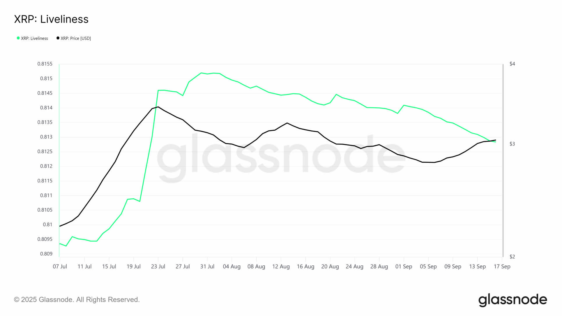Eine wichtige Stütze für den Markt ist das Verhalten der Langzeithalter. Die sogenannte Liveliness, ein Maßstab, der angibt, wie aktiv diese Gruppe ist, zeigt einen leichten Rückgang. Das bedeutet, dass Langzeitinvestoren ihre Münzen nicht massenhaft verkaufen und auch nicht stark zukaufen.
