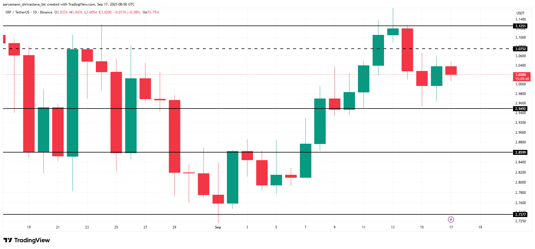 Zum Zeitpunkt des Schreibens notiert XRP bei etwa 3,02 Dollar, knapp über der kritischen Grenze. Die Münze testete kürzlich einen Widerstand bei 3,12 Dollar, konnte jedoch nicht darüber hinausgehen.