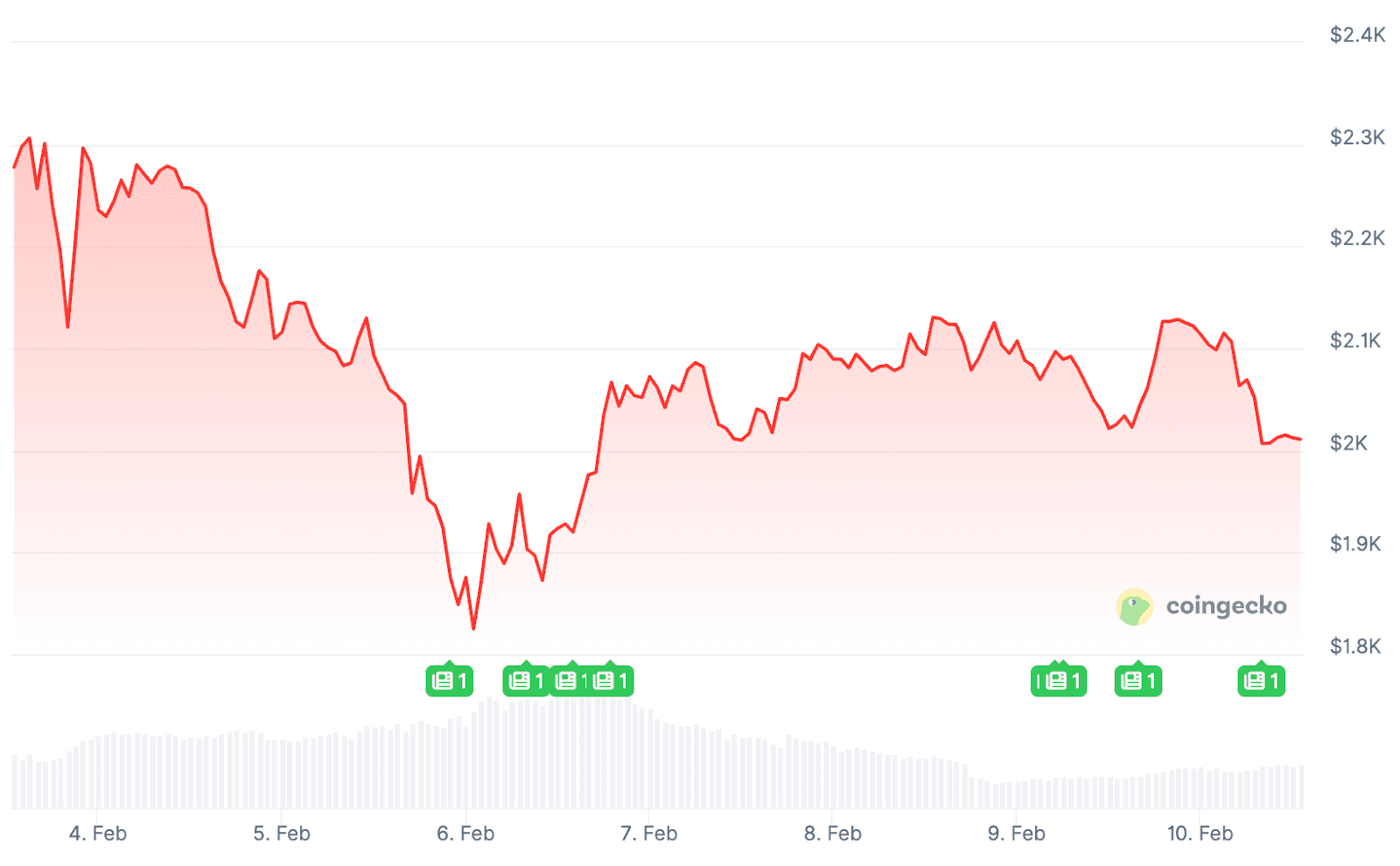 Der niedrige Z-Score geht mit erheblicher Volatilität einher. Ethereum fiel letzte Woche auf ein Tief von fast 1.700 Dollar. Inzwischen hat sich der Kurs leicht erholt und liegt zum Zeitpunkt des Schreibens knapp über 2.000 Dollar.