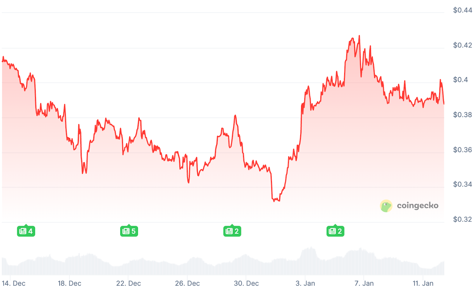 Cardano hat das Jahr stark begonnen. Zum Jahreswechsel lag der ADA-Kurs bei 0,33 Dollar, stieg aber innerhalb weniger Tage auf fast 0,44 Dollar an. Das entspricht einem Anstieg von etwa 33 Prozent in weniger als einer Woche.
