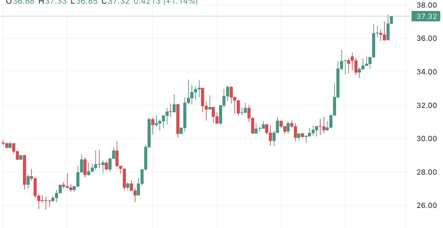 Der Preis von HYPE stieg in sieben Tagen um über 17 % auf 37,26 US-Dollar. Allein in den letzten 24 Stunden kamen 17,3 % hinzu. Die gesamte Marktkapitalisierung erreichte dadurch 9,6 Milliarden US-Dollar.
