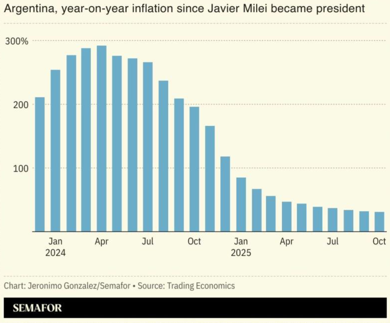 Argentinien hat es seit April 2024 geschafft, die Inflation von 300 Prozent auf 31 Prozent zu senken. Die Reformen von Präsident Javier Milei, darunter harte Sparmaßnahmen und das Stoppen der Geldschöpfung, tragen maßgeblich zu diesem Rückgang bei.