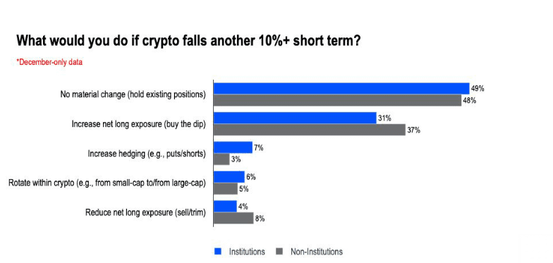 Bemerkenswert ist, wie institutionelle Investoren auf weitere Kursrückgänge reagieren wollen. Etwa 80 Prozent geben an, Bitcoin halten oder sogar zukaufen zu wollen, falls der Markt um weitere 10 Prozent sinkt. Mehr als 60 Prozent haben seit Oktober ihre Bitcoin-Position entweder gehalten oder ausgebaut.