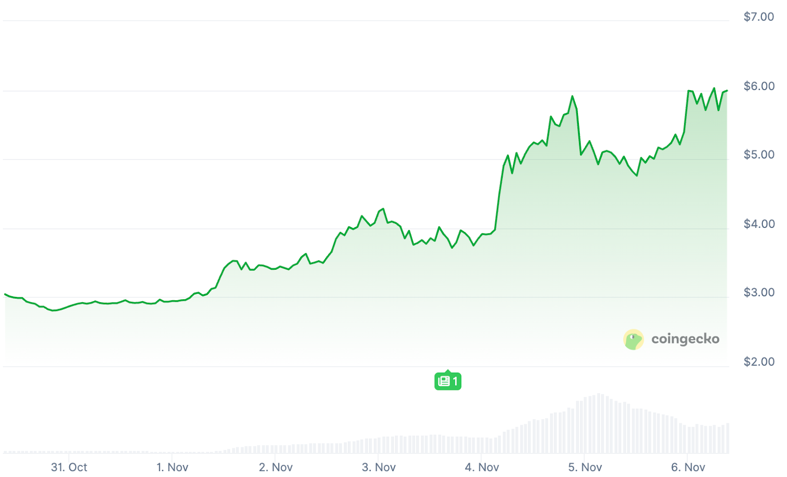 Während große Coins wie Bitcoin (BTC), Ethereum (ETH) und Solana (SOL) in dieser Woche tief im Minus notieren, schießt der ICP-Kurs nach oben. Binnen sieben Tagen legte der Preis um satte 97 Prozent zu auf fast 6 Dollar – der höchste Stand seit August.