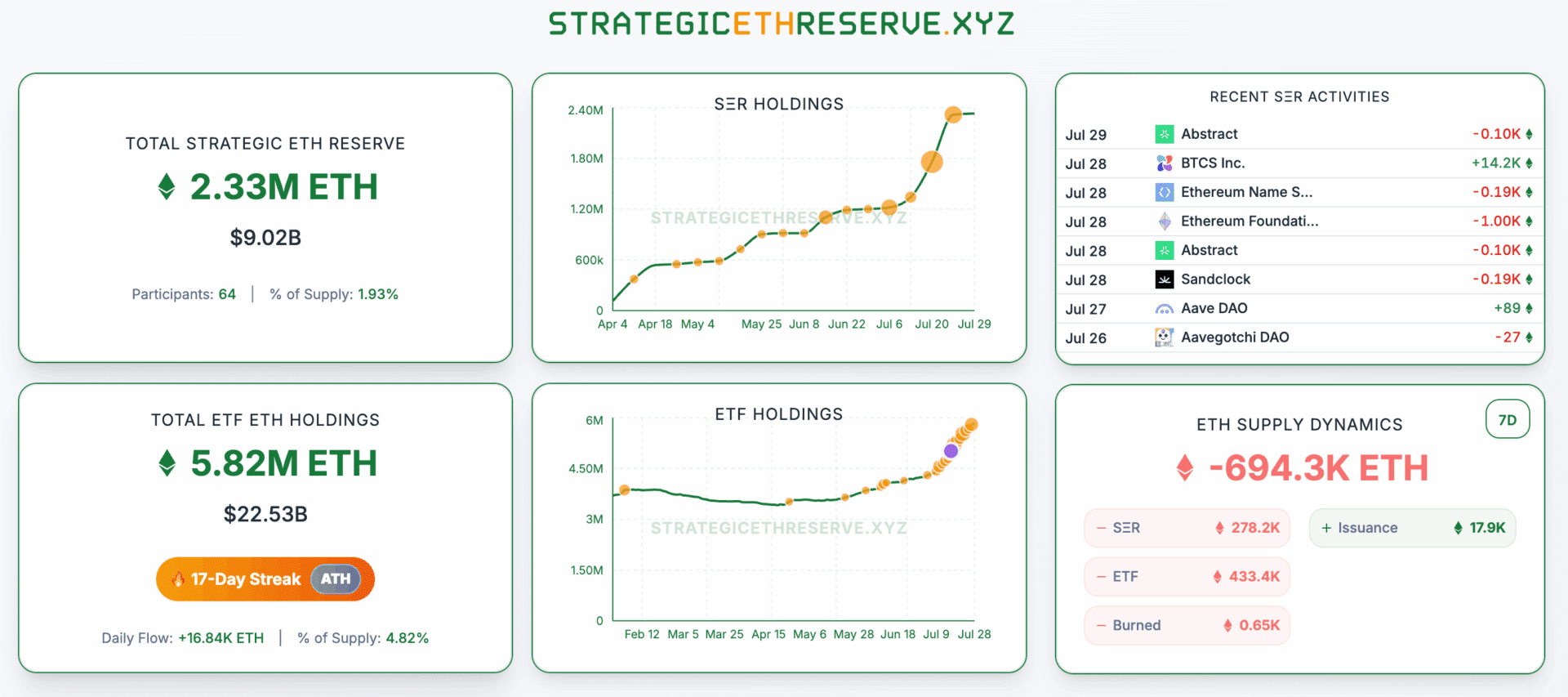 Aus Daten der Strategic ETH Reserve geht hervor, dass 64 Unternehmen nun zusammen 2,33 Millionen Ethereum besitzen, mit einem Gesamtwert von über 9 Milliarden Dollar. Im Mai lag diese Zahl noch bei etwas weniger als 790.000 ETH. Damit hat sich der Besitz in nur zwei Monaten um fast 200 Prozent erhöht.