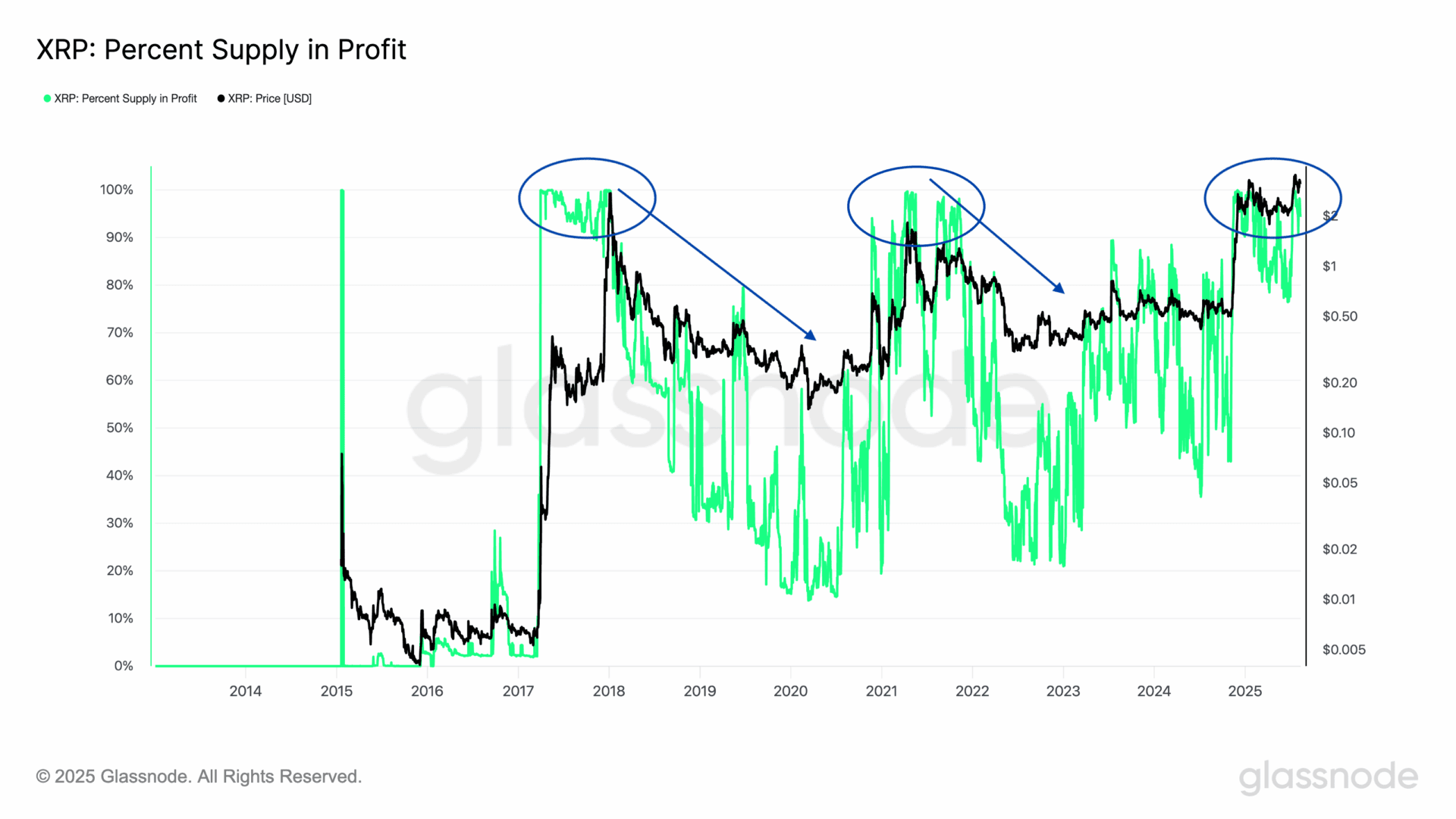 Außerdem gilt, dass mehr als 95 Prozent der im Umlauf befindlichen XRP derzeit auf einem virtuellen Gewinn stehen. In früheren Perioden führte das zu Verkaufsdruck, weil Anleger diese Gewinne sichern wollten.