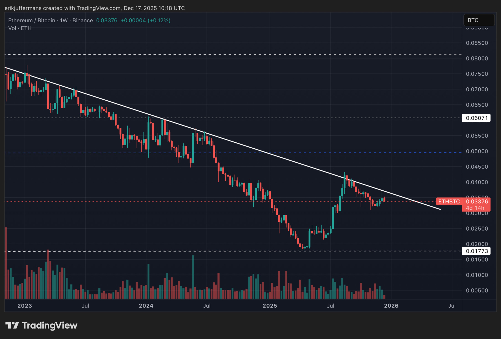 Betrachten wir noch das ETH/BTC-Chart. Wir sehen, dass ETH gegenüber BTC weiterhin mit der langjährigen abfallenden Widerstandslinie zu kämpfen hat. Für die ETH-Bullen heißt es abzuwarten, bis es zu einem Durchbruch und einem Wochenschluss über dieser Trendlinie kommt. Bis dahin ist es noch ein weiter Weg. Eine Zurückweisung könnte zu einem neuen abwärtsgerichteten Wochentrend führen.