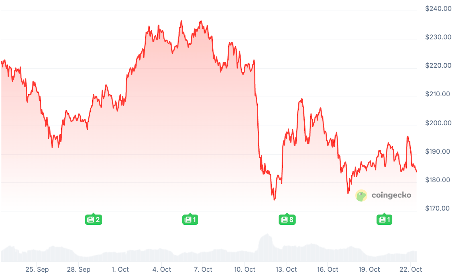 Zum Zeitpunkt des Schreibens notiert SOL bei rund 184 Dollar. Damit liegt der Token noch immer gut 37 Prozent unter seinem Allzeithoch von 293 Dollar, das Anfang dieses Jahres erreicht wurde.