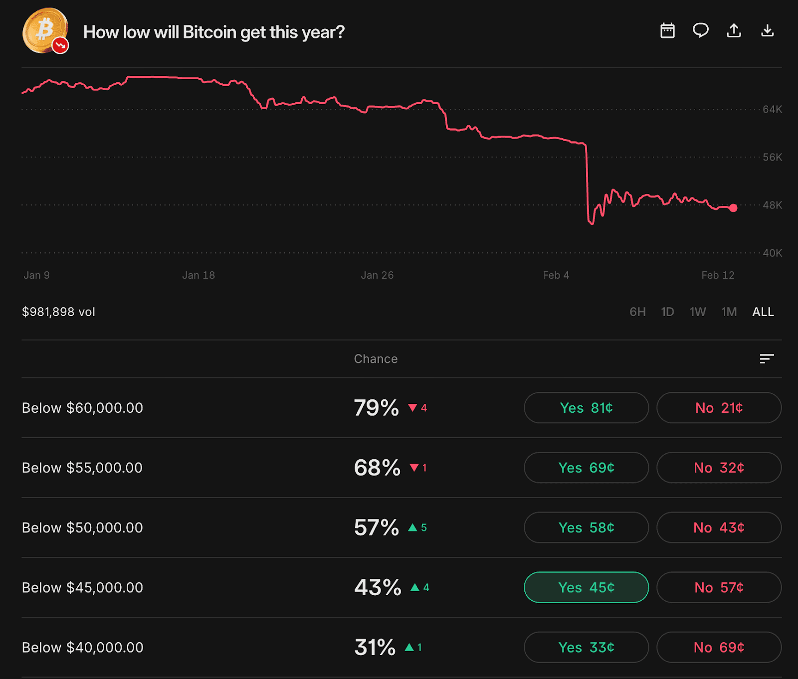 Händler auf Kalshi prognostizieren, dass der Bitcoin-Kurs im Jahr 2026 auf 40.000 Dollar sinken könnte. Es wird stark gewettet: Das Handelsvolumen auf der Plattform liegt derzeit bei fast 1 Million Dollar.