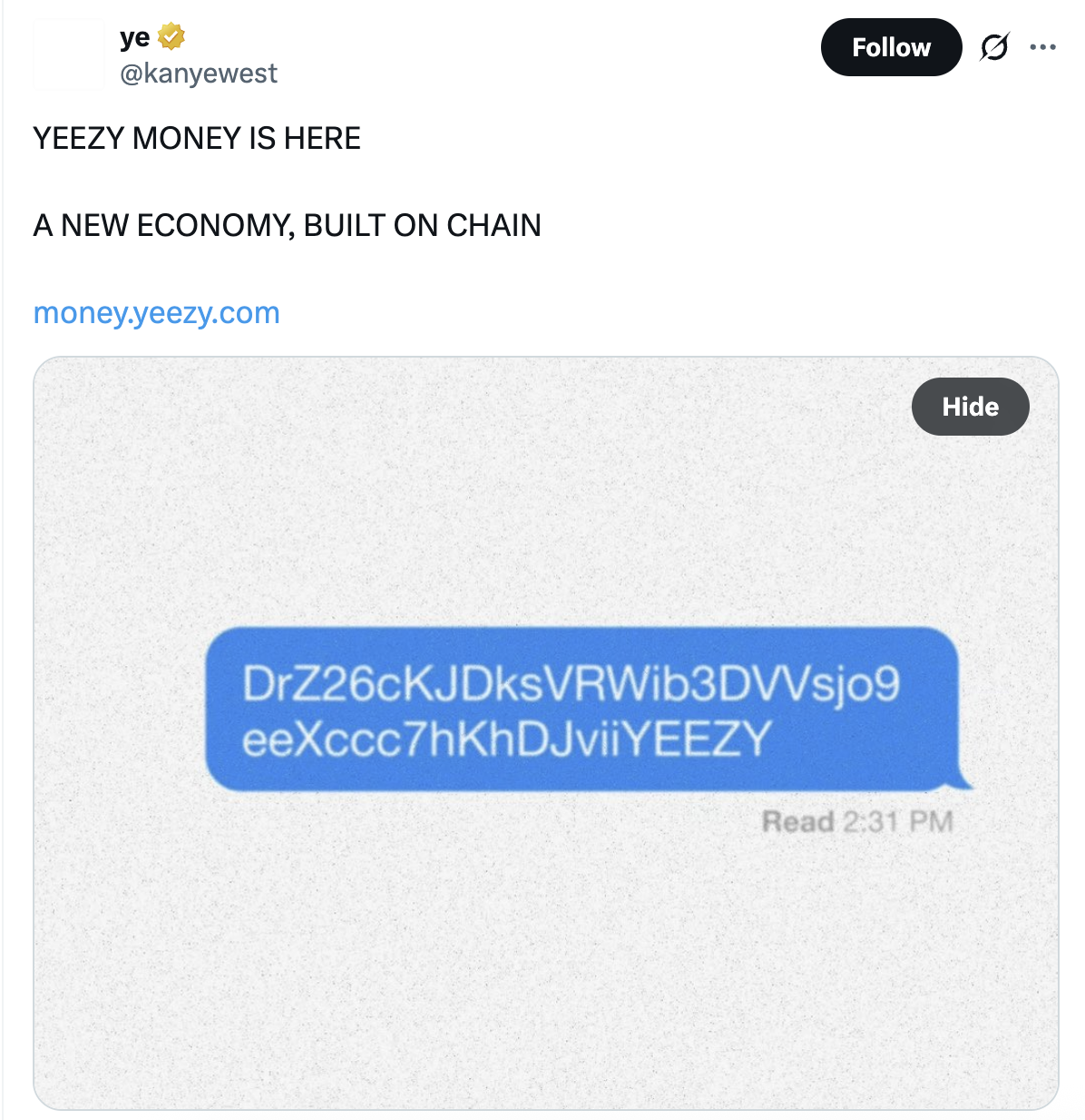 In der Ankündigung auf X schreibt Kanye: „YEEZY MONEY ist angekommen. Eine neue Wirtschaft, aufgebaut auf der Blockchain.“