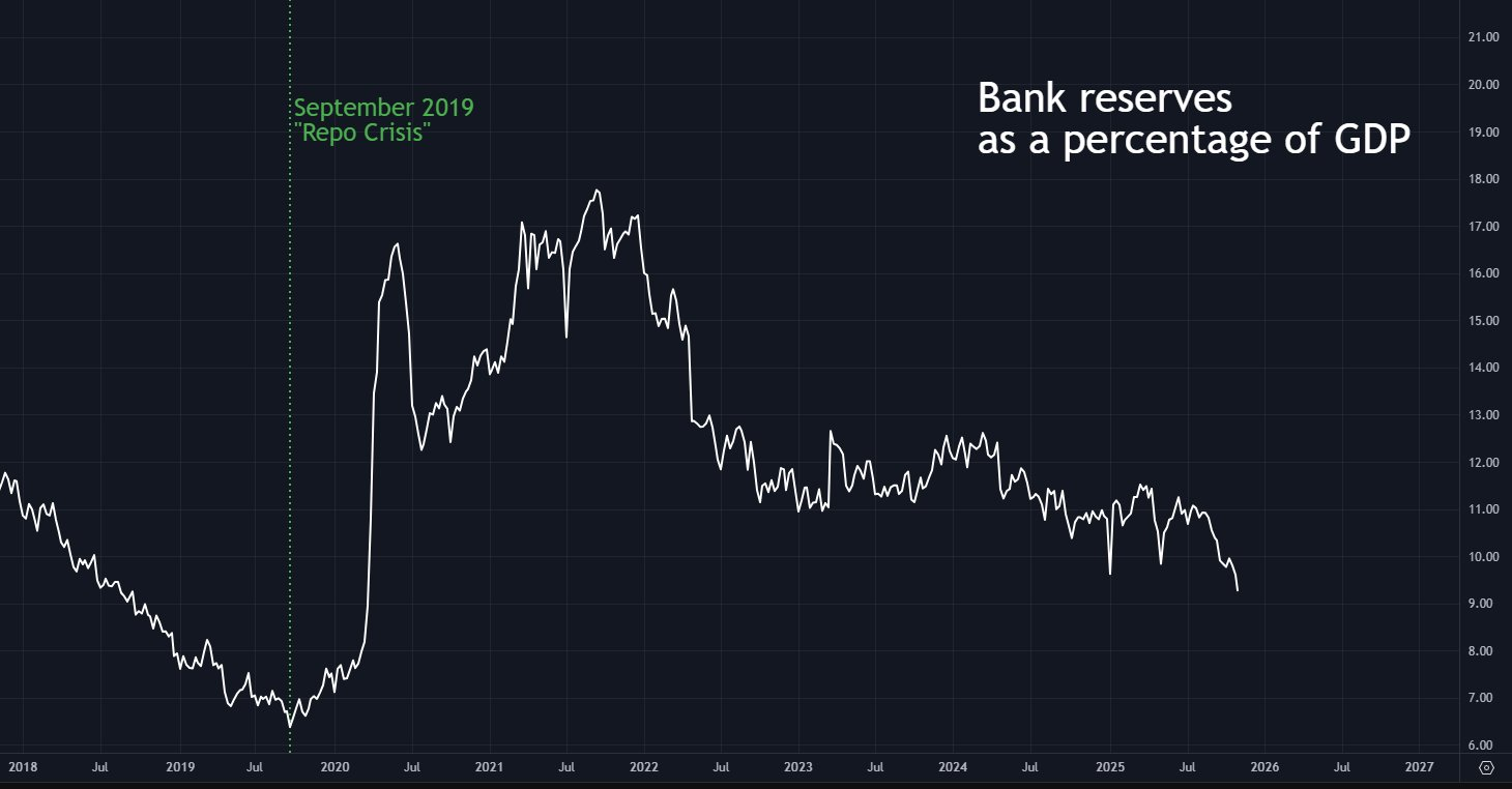 Die Federal Reserve scheint sich dessen bewusst zu sein. Sie beendet zum 1. Dezember das Quantitative Tightening (QT), womit der Abwärtsdruck auf die Bankreserven weitgehend entfällt.