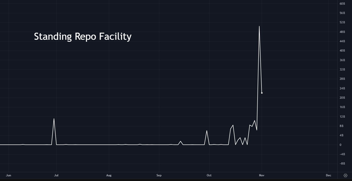 Am vergangenen Freitag wurden über die Standing Repo Facility der Fed 50 Milliarden Dollar aufgenommen. Das sind kurzfristige, eintägige Kredite an Banken, die vorübergehend unter Liquiditätsengpässen leiden.