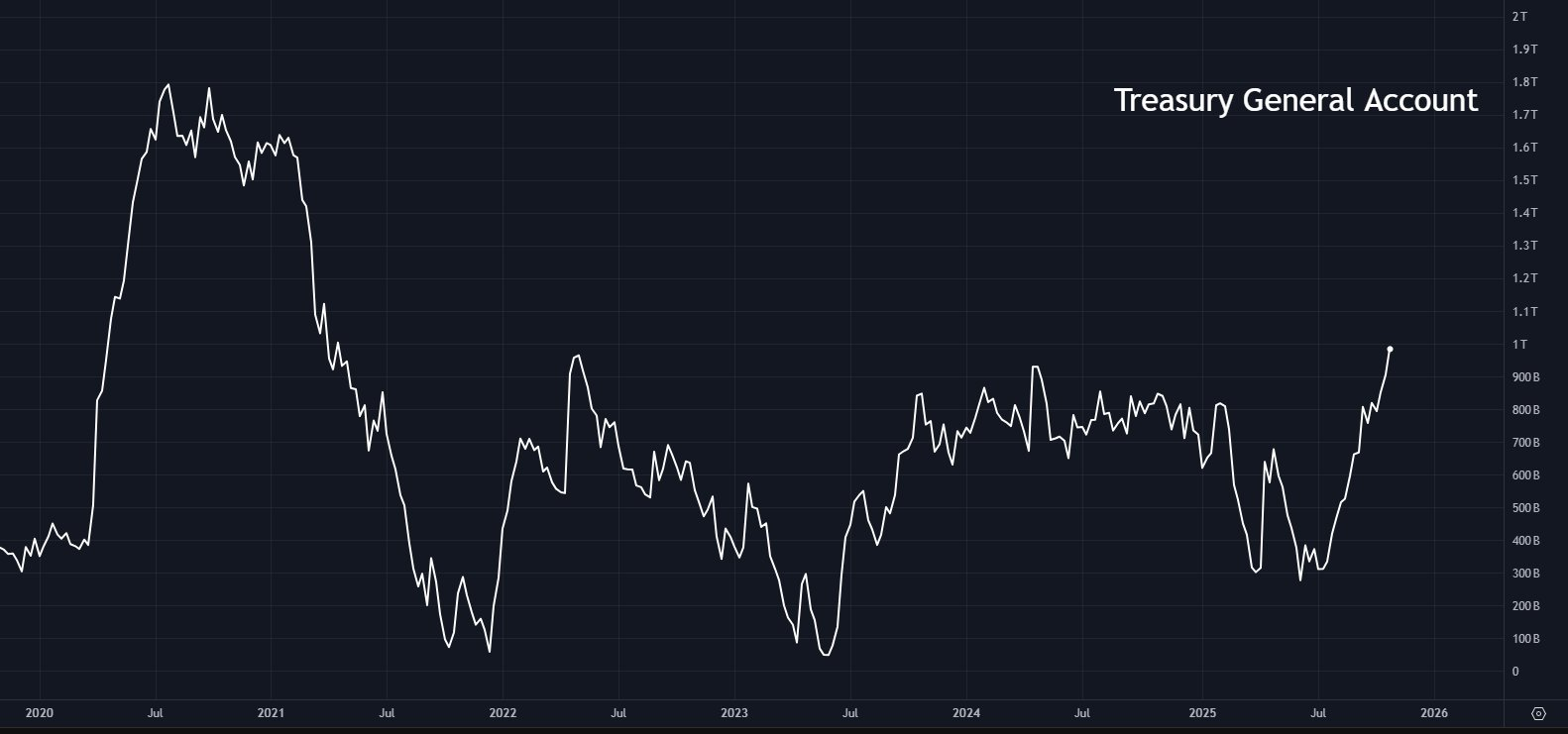 Seit Juni füllt die US-Regierung ihr Treasury General Account (TGA) wieder auf – de facto das Regierungskonto bei der Federal Reserve. Ziel war, den Kontostand auf rund 850 Milliarden Dollar zu erhöhen.