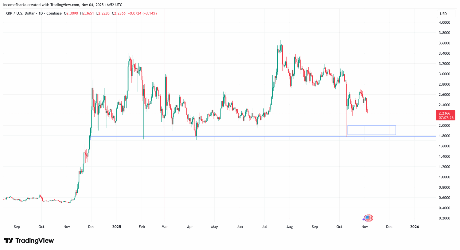 Der bekannte Analyst Income Sharks ließ gestern wissen, dass „wer XRP unter 2 Dollar verpasst hat, möglicherweise eine zweite Chance bekommt“. Seiner Einschätzung nach könnte die anhaltende Volatilität am Markt dazu führen, dass XRP vorübergehend in die Zone zwischen 1,8 und 2 Dollar zurückfällt. Dort liege seiner Analyse zufolge eine wichtige „Nachfragezone“, ein Niveau, auf dem zuvor viele Käufer aktiv waren.