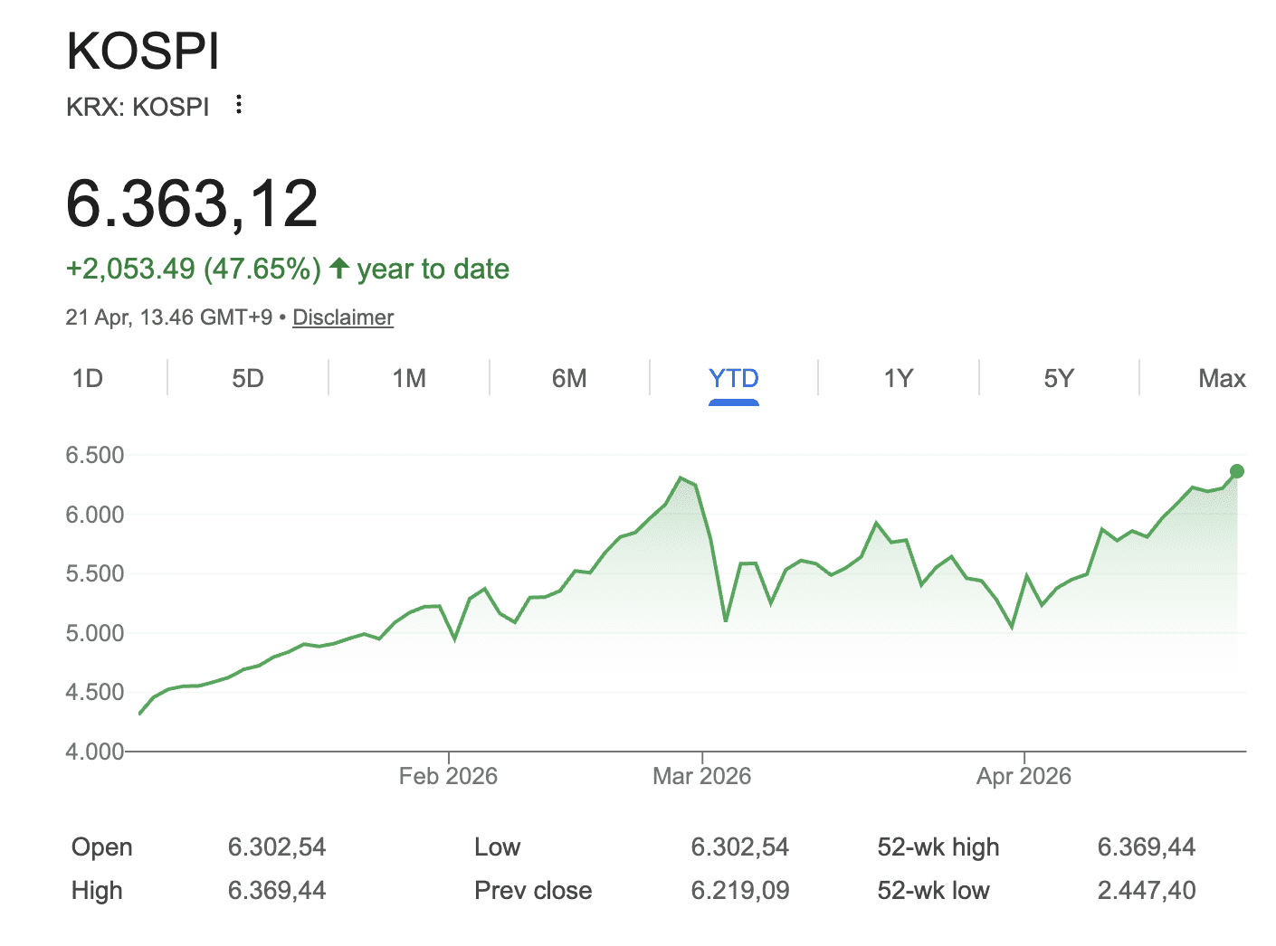 Der südkoreanische Aktienmarkt stieg am Dienstagmorgen auf ein neues Rekordhoch. Der Kospi kletterte im frühen Handel über die Marke von 6.360 Punkten und übertraf damit das bisherige Rekordniveau von Februar. Allein heute bedeutet das ein Plus von über 2 Prozent und die Jahresrendite liegt bei fast 50 Prozent.