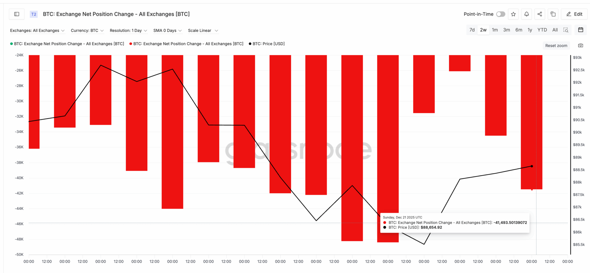 Laut On-Chain-Daten ist die Anzahl der Bitcoin, die von zentralisierten Börsen abgezogen werden, in kurzer Zeit stark gestiegen. Am 19. Dezember wurden netto etwa 26.000 Bitcoin von Börsen abgezogen. Zwei Tage später stieg die Zahl auf über 41.000 Bitcoin, ein Anstieg von fast 60 Prozent.
