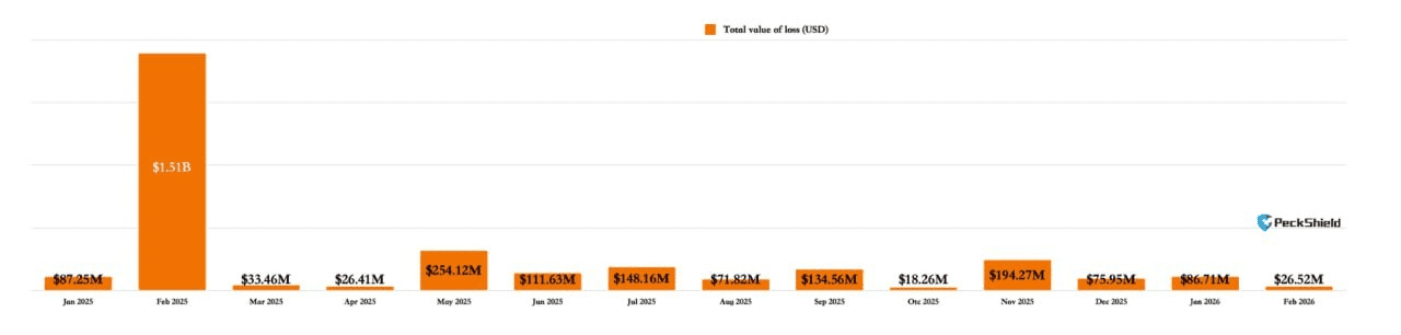 Laut PeckShield liegt das unter anderem daran, dass außergewöhnlich große Hacks ausblieben. Im Februar des Vorjahres wurde beispielsweise die Kryptobörse Bybit von einem Hack in Höhe von 1,5 Milliarden Dollar getroffen, wodurch der Gesamtschaden im Monat erheblich anstieg.