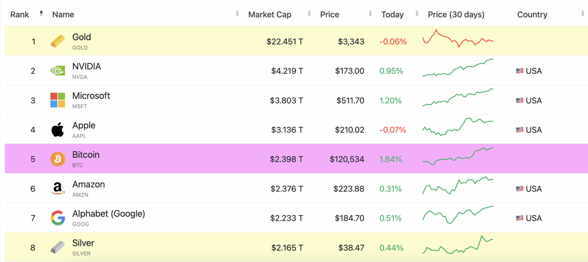 Bitcoin klettert auch für sich allein recht gut. Die Industrie als Ganzes muss jetzt jedoch nur noch Nvidia vor sich dulden, wenn es um Unternehmen geht. Anschließend finden wir natürlich Gold auf Platz 1, mit einem Marktwert von über 22 Billionen Dollar.