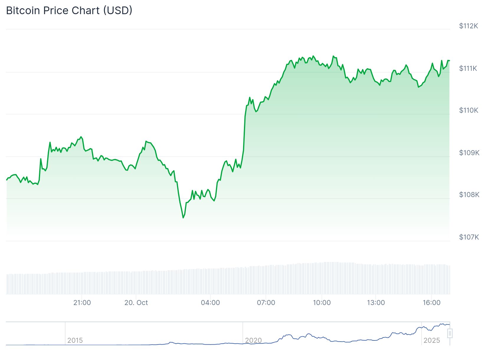 Zum Zeitpunkt des Schreibens liegt der BTC-Kurs bei 111.352 Dollar, ein Plus von 2,77 Prozent in den vergangenen 24 Stunden. In Euro werden derzeit 95.729 Euro für die Kryptowährung bezahlt.