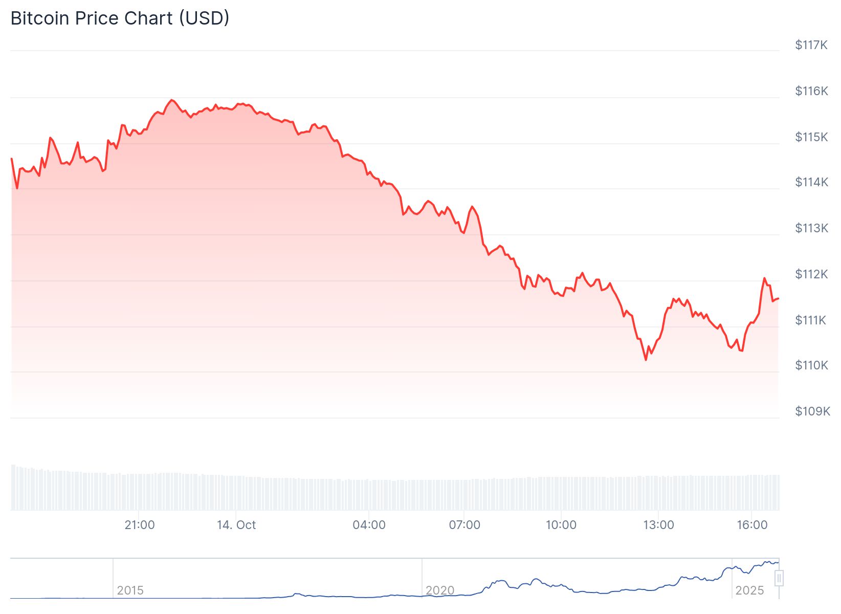 Gegen 12:45 Uhr fiel Bitcoin kurz unter 110.000 Dollar. Danach erholte er sich auf 111.700 Dollar, um anschließend erneut Richtung 110.000 Dollar zu rutschen.