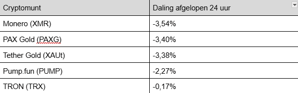 Einige wenige Coins erleben auch heute einen Rückgang. Dabei ist zu erwähnen, dass zwei Coins – PAX Gold und Tether Gold – an den Goldpreis gekoppelt sind. Hier die größten Top-100-Verlierer der letzten 24 Stunden:
