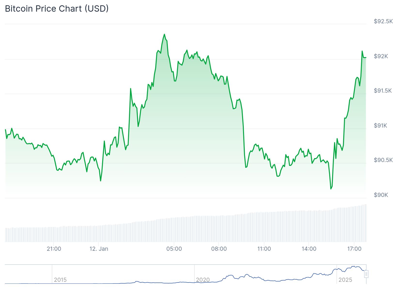 Der Bitcoin-Kurs stieg in der Nacht von etwa 90.200 Dollar auf einen Höchststand von 92.400 Dollar, doch am Morgen wurde die gesamte Rally in kurzer Zeit wieder aufgehoben.