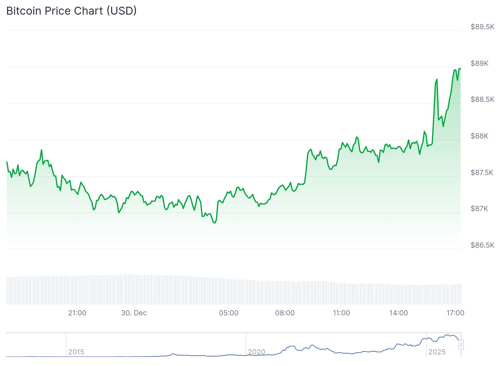 Inzwischen steht die Marke von 89.000 US-Dollar wieder auf den Anzeigetafeln. Das ist ein Anstieg von 2,5 Prozent seit dem Tiefpunkt der vergangenen Nacht.