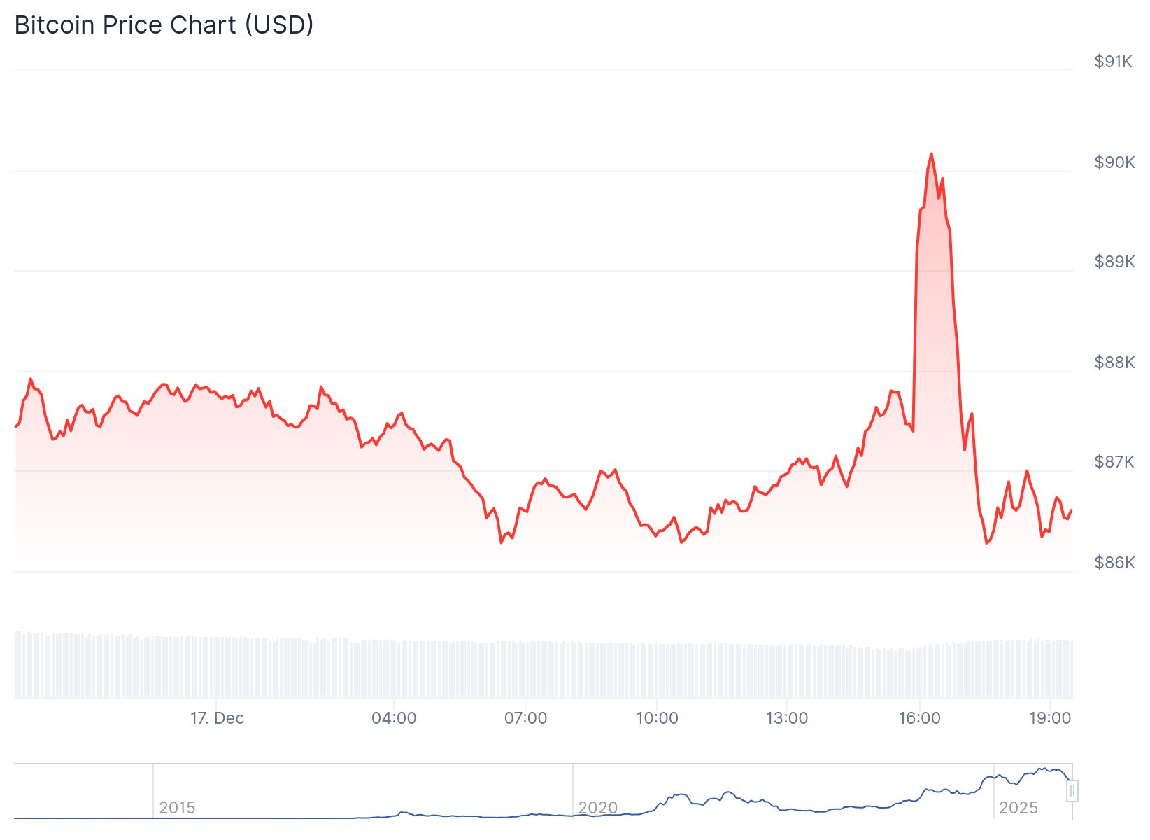 Kurz vor 16:00 Uhr schoss der Kurs plötzlich in die Höhe. Innerhalb von 25 Minuten stieg er von 87.400 Dollar auf einen Höchststand von 90.300 Dollar, ein kräftiger Anstieg von 3,3 Prozent.