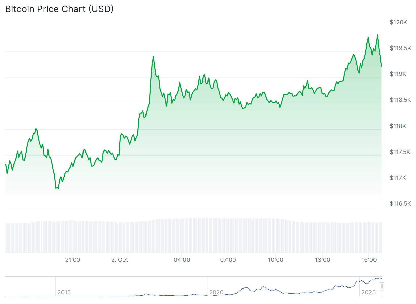 Zum Zeitpunkt des Schreibens steht der Bitcoin-Kurs bei 119.143 Dollar, ein Anstieg um 1,98 Prozent im Vergleich zu vor 24 Stunden. In Euro werden derzeit 102.294 für den Kryptokönig bezahlt.