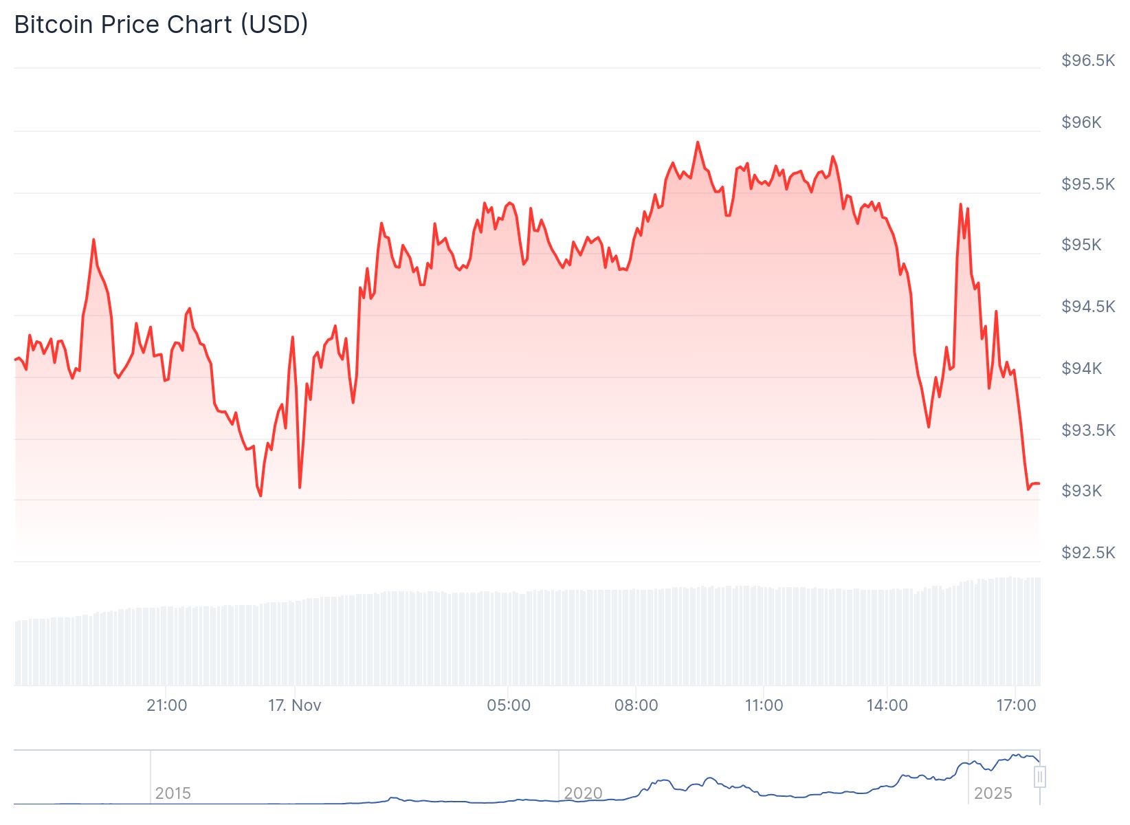 Gestern spät am Abend fiel der Bitcoin-Kurs auf sein niedrigstes Niveau seit Ende April von 93.000 Dollar und liegt nur knapp darüber. Dennoch gab es ein paar hoffnungsvolle Aufwärtsbewegungen, doch jedes Mal kamen die Verkäufer noch stärker zurück.