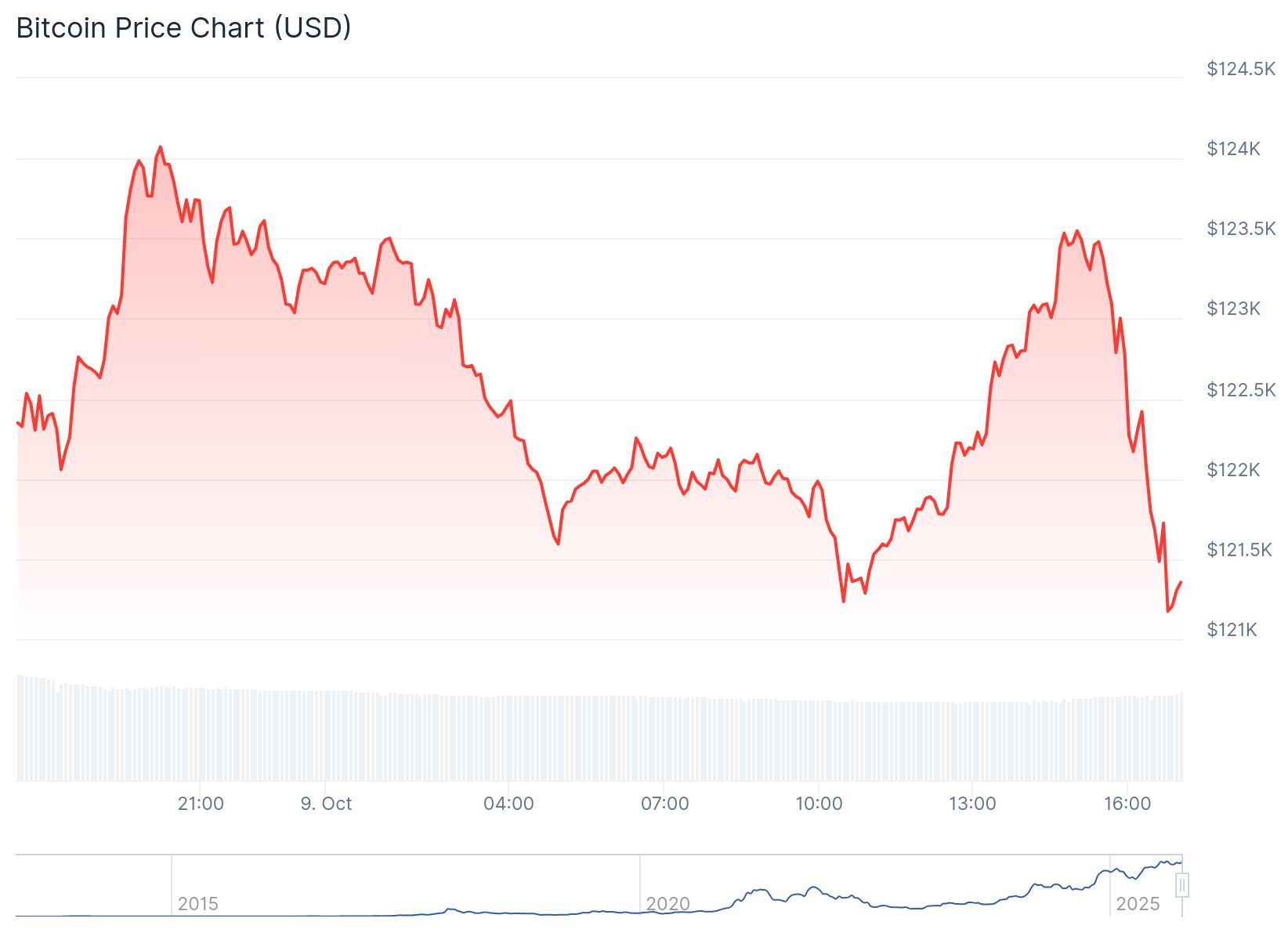 Bitcoin ist von 123.500 auf aktuell 121.000 US-Dollar gefallen. Damit liegt der Kurs wieder auf dem Niveau von heute Morgen. Zwischenzeitlich ging es sogar noch etwas tiefer, mit 120.800 US-Dollar als Tagestief. Die gesamte Erholung von heute, die vier Stunden gebraucht hat, wurde nun in deutlich höherem Tempo wieder ausradiert.