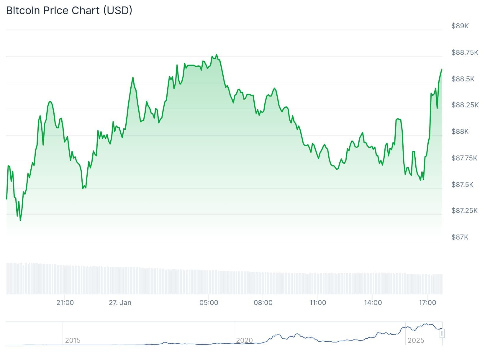 Tief in der Nacht konnte Bitcoin fast die 89.000 Dollar erreichen, verfehlte dieses Ziel jedoch knapp, ähnlich wie am Vortag. Danach folgte ein langer Rückgang, der am Mittag bei einem Tiefstand von 87.700 Dollar stoppte.