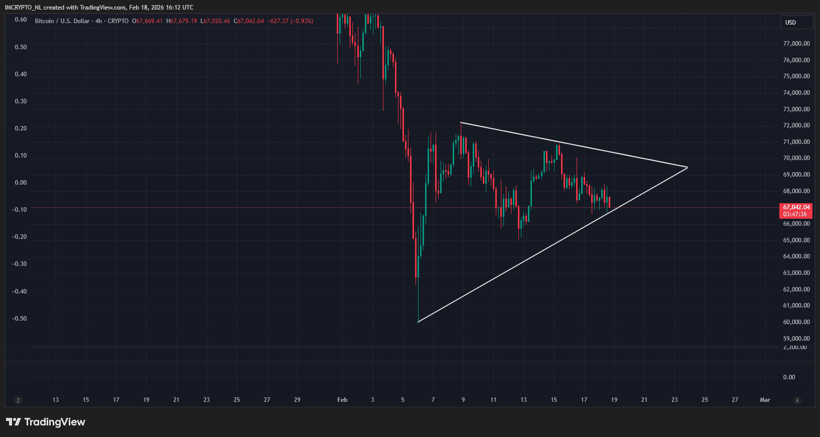 Auf dem Vierstunden-Chart bewegt sich Bitcoin deutlich in einem symmetrischen Dreieck mit tieferen Hochs und höheren Tiefs. Da der übergeordnete Trend seit Monaten abwärtsgerichtet ist, befürchten viele Analysten einen massiven Ausbruch nach unten.