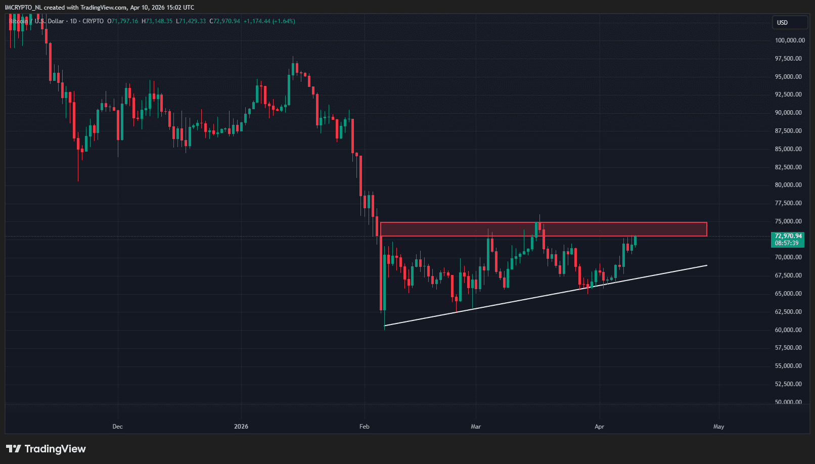 Allgemein gilt: Je häufiger ein Widerstand getestet wird, desto schwächer wird er. Aber solange der Kurs unter 75.000 Dollar bleibt.