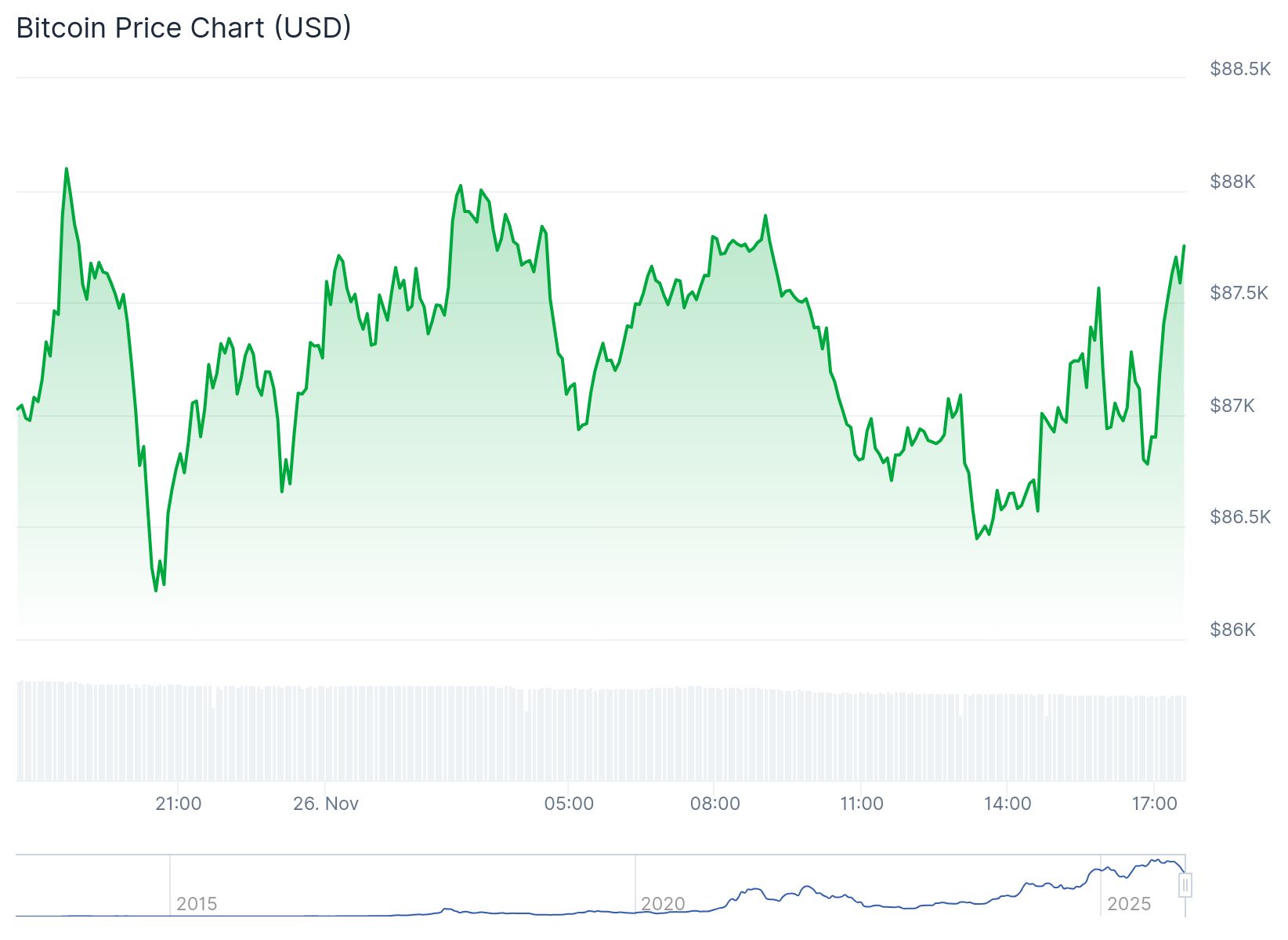 Zum Zeitpunkt des Schreibens liegt der BTC-Kurs bei 87.675 Dollar, 0,65 Prozent höher als vor 24 Stunden. In Euro werden aktuell 75.611 für die größte Kryptowährung bezahlt.
