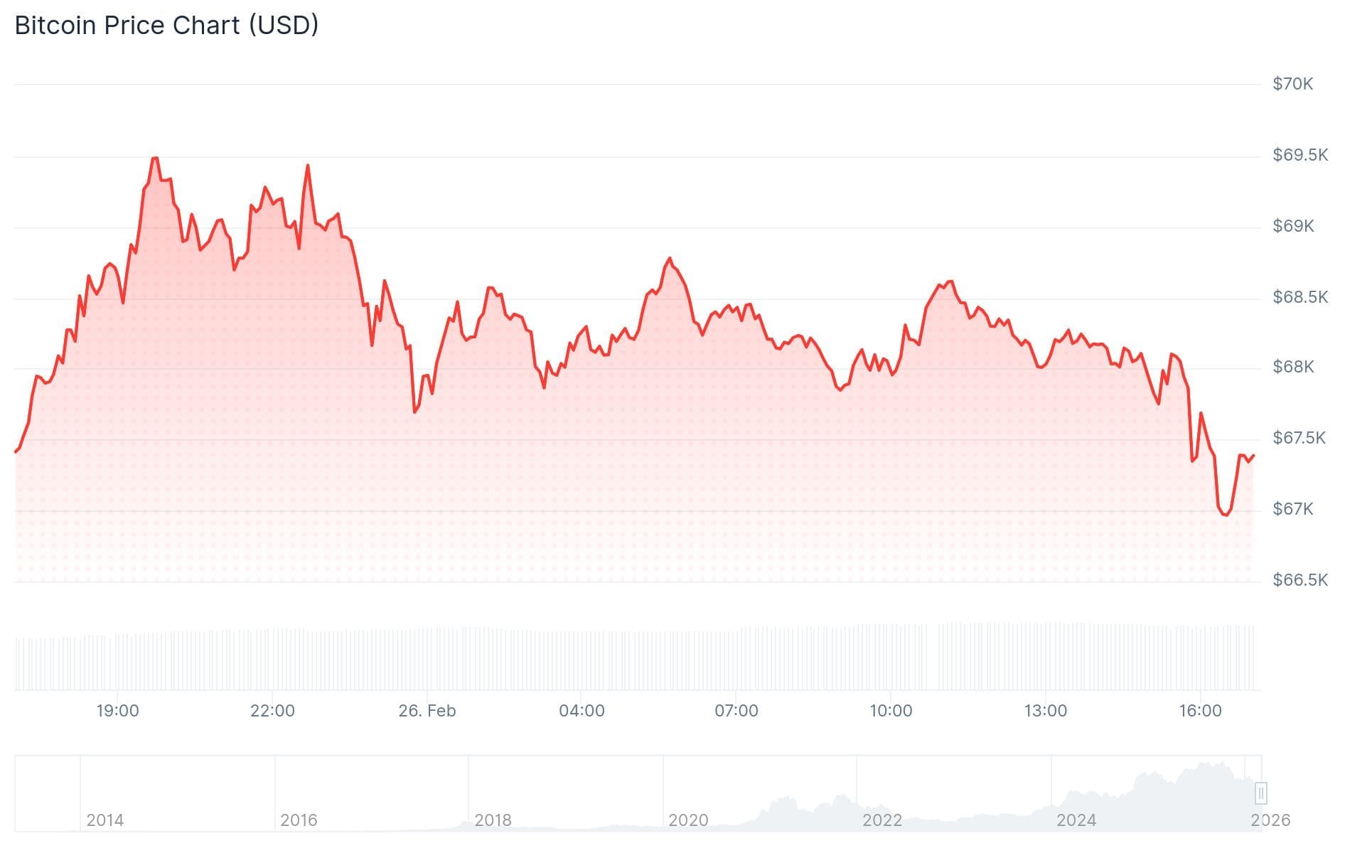 Bitcoin kletterte von 64.000 Dollar auf 70.000 Dollar und schloss bei 68.000 Dollar. Heute fiel er zurück auf 66.800 Dollar und liegt inzwischen wieder deutlich über 67.000 Dollar. Die Marke von 67.500 Dollar ist entscheidend, um wieder darüber zu steigen.