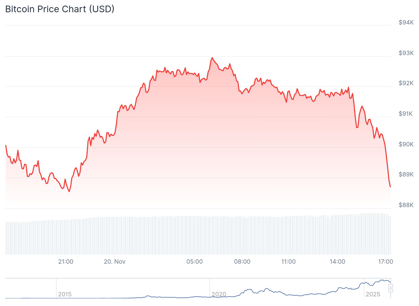 Gestern lag das Tief bei 88.600 Dollar, und nun hat Bitcoin auch die 88.500 Dollar angetippt. Gut möglich, dass der Kurs noch tiefer steht, wenn du das hier liest.