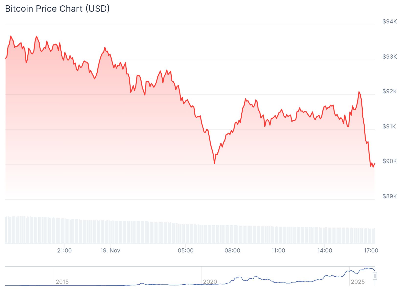 Zum Zeitpunkt des Schreibens steht der Bitcoin-Kurs bei 89.906 Dollar, 2,84 Prozent niedriger als vor 24 Stunden. In Euro werden derzeit 77.813 für die größte Kryptowährung bezahlt.