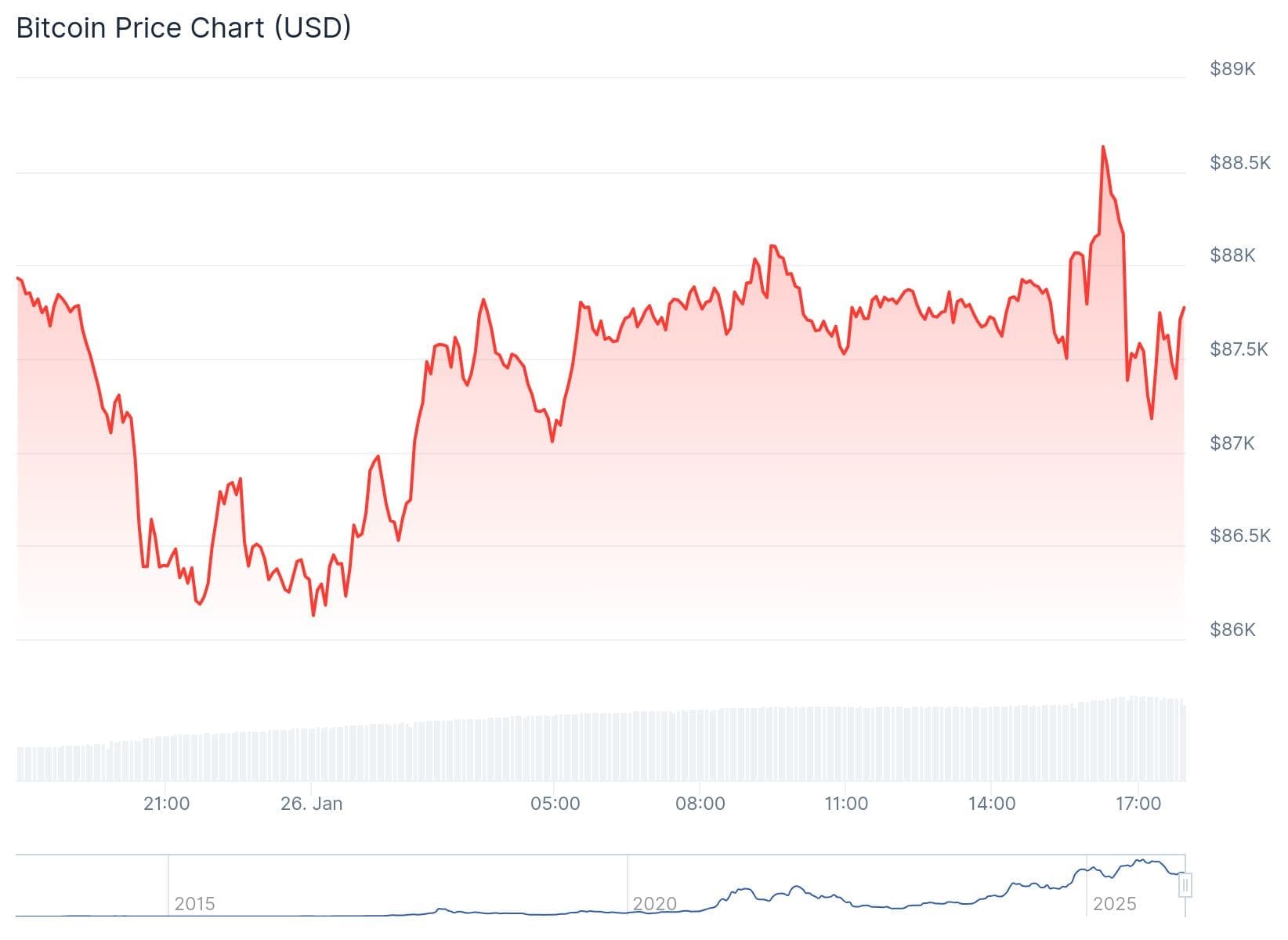 Der Bitcoin-Kurs sank von 89.200 USD auf ein Tief von 86.000 USD. In der Nacht erholte er sich auf fast 88.000 USD und am Nachmittag wurde nach einem erneuten Sprung beinahe die 89.000 USD-Marke erreicht.