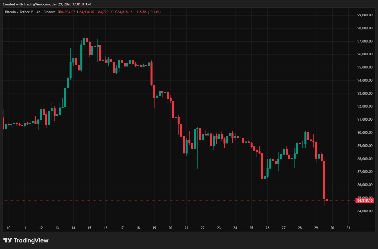 Am Donnerstag erlitt der Kryptomarkt einen erheblichen Rückschlag. Bitcoin (BTC) fiel um 5,2 Prozent und sank auf 84.603 Dollar. Ethereum (ETH) und andere Altcoins verzeichneten noch stärkere Verluste. Der Verkaufsdruck nahm sprunghaft zu, kurz nachdem die Wall Street den Handel eröffnete, was kein Zufall ist.