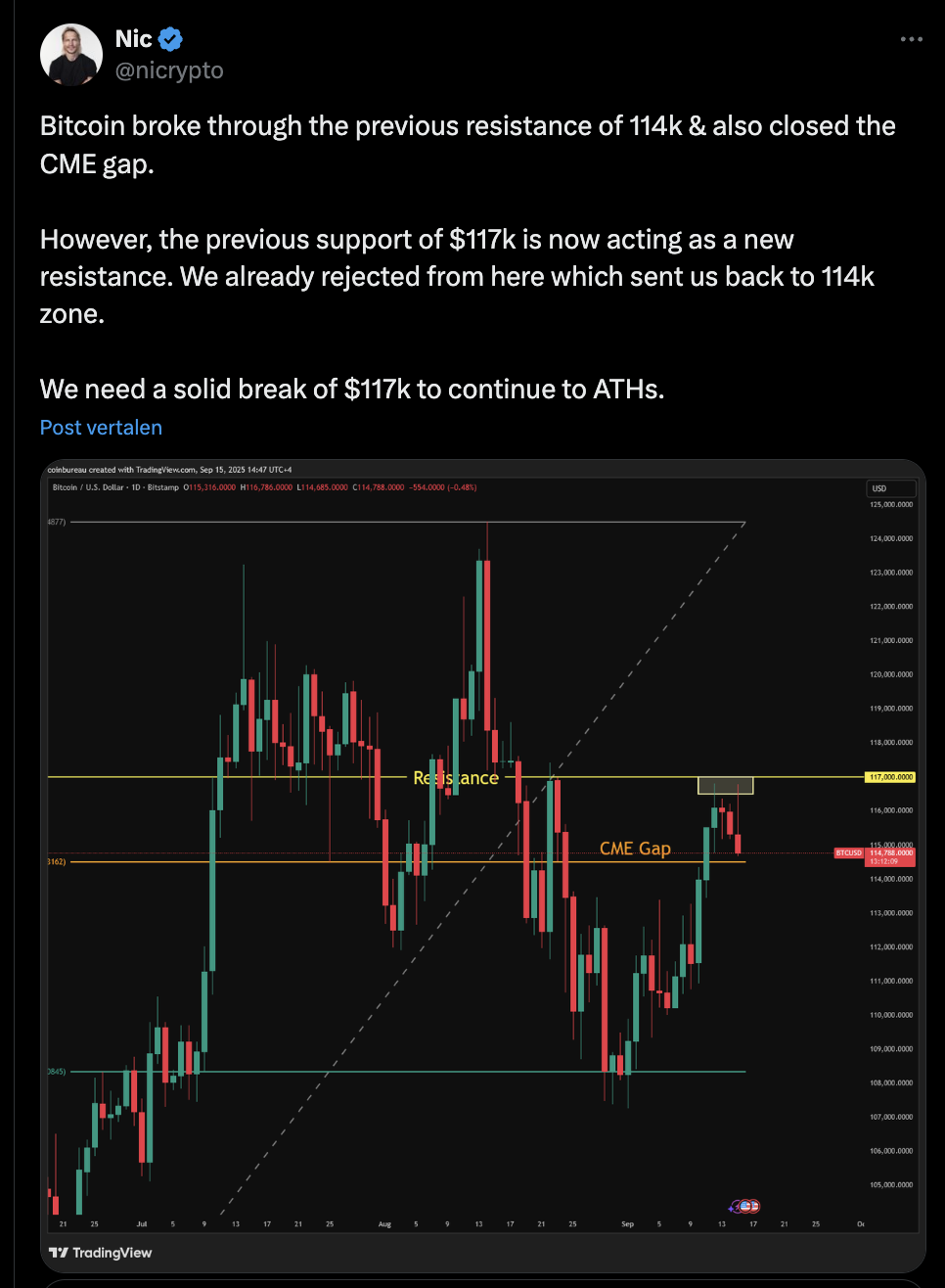 Wenn die Käufer das Niveau von 114.000 Dollar erfolgreich verteidigen können, dann ist noch nicht viel passiert. 117.000 Dollar haben auch im letzten Monat schon öfter Probleme verursacht, daher ist es nicht verwunderlich, dass der Kurs hier nicht auf einmal durchbricht. Und vergessen Sie nicht, dass Bitcoin in den letzten Wochen bereits um fast 9 Prozent gestiegen ist.