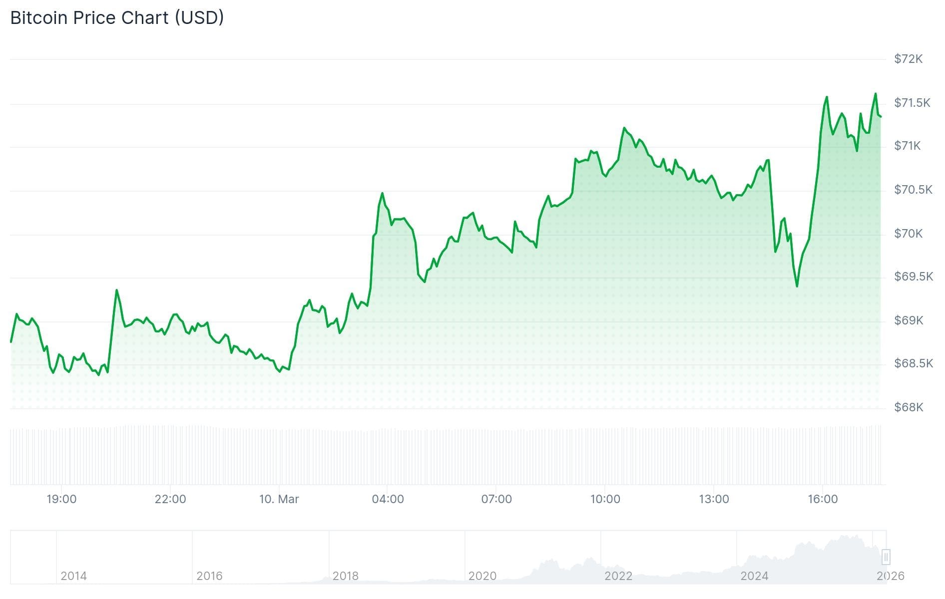 Bitcoin ist auf seinen höchsten Kurs seit letztem Donnerstag gestiegen und notiert bei fast 71.800 Dollar. In zwei Tagen hat er bereits über 9 Prozent an Wert gewonnen.