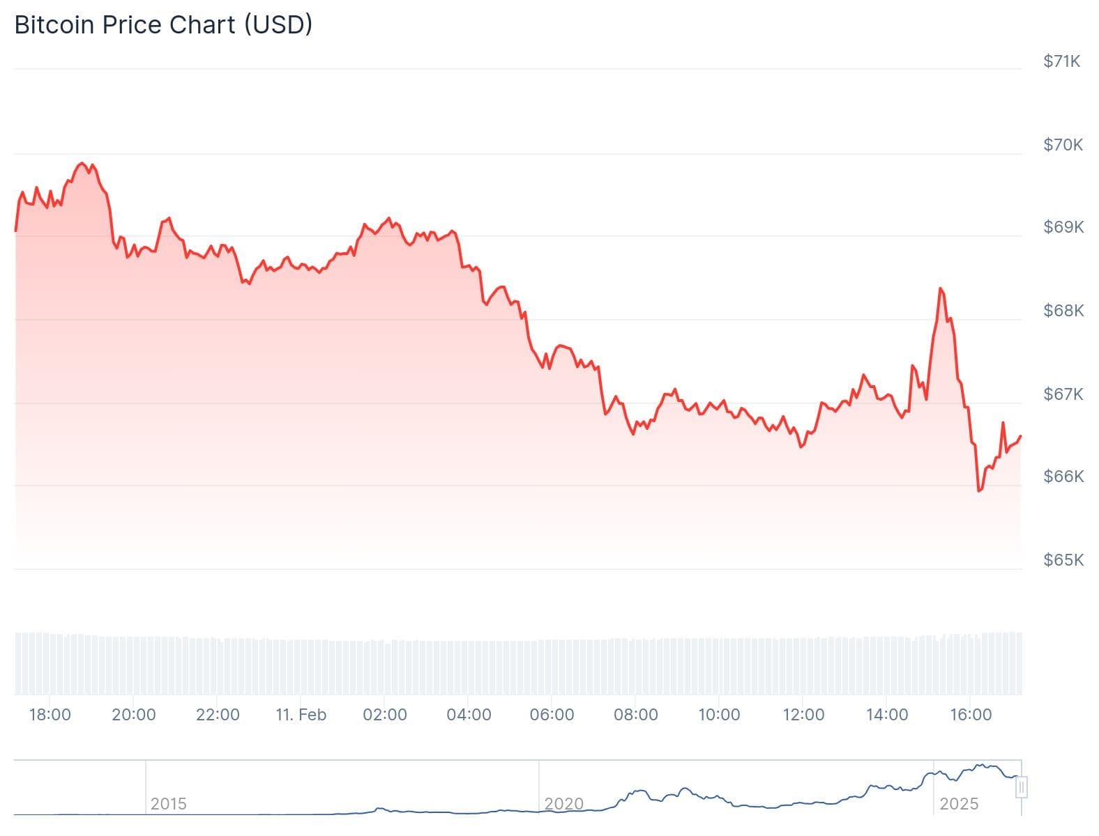 Der Bitcoin-Kurs begann bereits in der Nacht zu sinken. Gegen 3 Uhr morgens lag er noch bei 69.000 Dollar, doch gerade ist er unter die Marke von 66.000 Dollar gefallen. Dieses Niveau haben wir seit letztem Freitag nicht mehr gesehen.