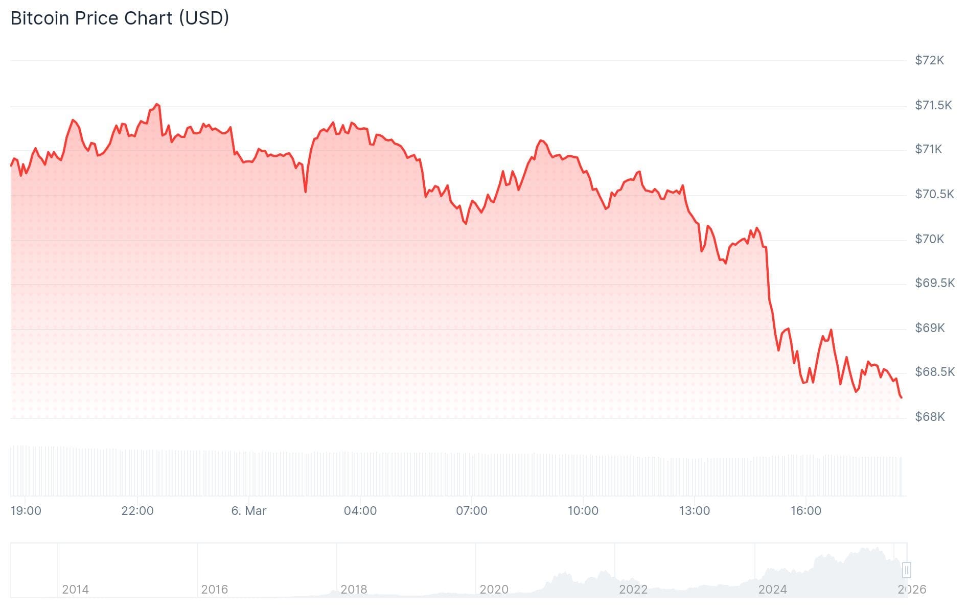 Nachdem er gestern 2,44 Prozent verloren hatte, steht er heute 3,40 Prozent im Minus. Konkret ist er von 71.000 Dollar auf ein aktuelles Niveau von knapp über 68.000 Dollar gefallen.