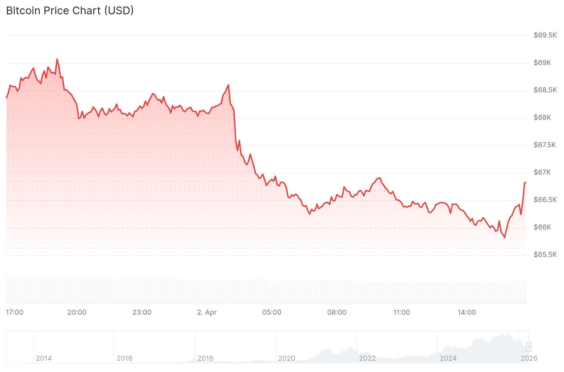 Bitcoin zeigt heute wenig Aufwärtstrend. Der Kurs der größten Kryptowährung ist seit letzter Nacht um mehr als 4 Prozent gefallen. Genauer gesagt, ist er von 68.600 Dollar auf ein Tief von 65.700 Dollar gesunken.