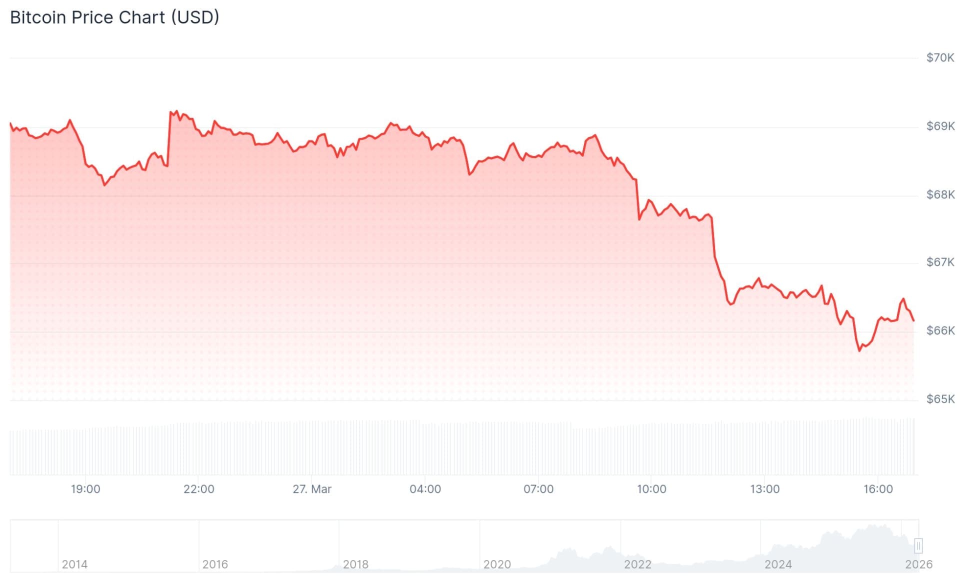 Vorläufiger Tiefpunkt war um 15:45 Uhr bei etwa 66.000 Dollar. So günstig war der Coin seit Montag, dem 9. März, nicht mehr.
