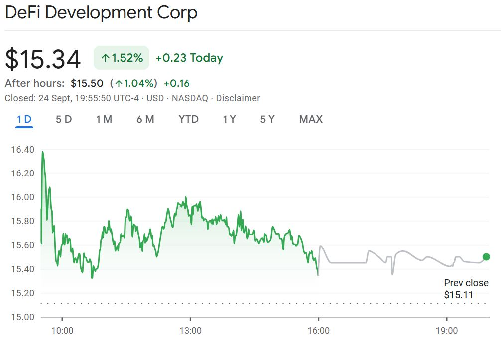 Auch DeFi Development Corp, ein mit Solana verbundenes Unternehmen, erweiterte das Rückkaufprogramm von 1 Million auf 100 Millionen Dollar. Die Aktie legte zunächst um 5 Prozent zu und schloss letztendlich mit einem Plus von 2 Prozent.