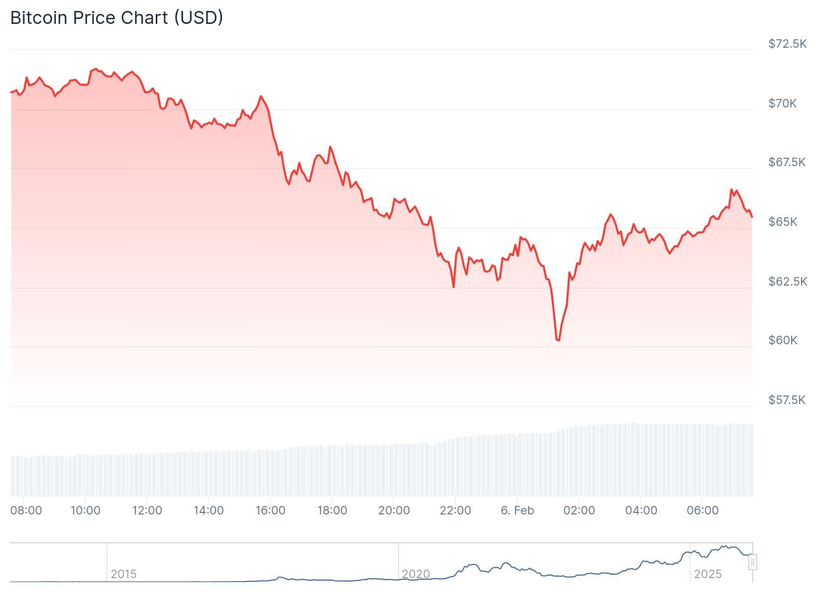 Der BTC-Kurs hat sich inzwischen etwas erholt und liegt nun bei 65.545 Dollar, 6,91 Prozent niedriger als vor 24 Stunden. In Euro entspricht das einem Preis von 55.705 für die größte Kryptowährung.