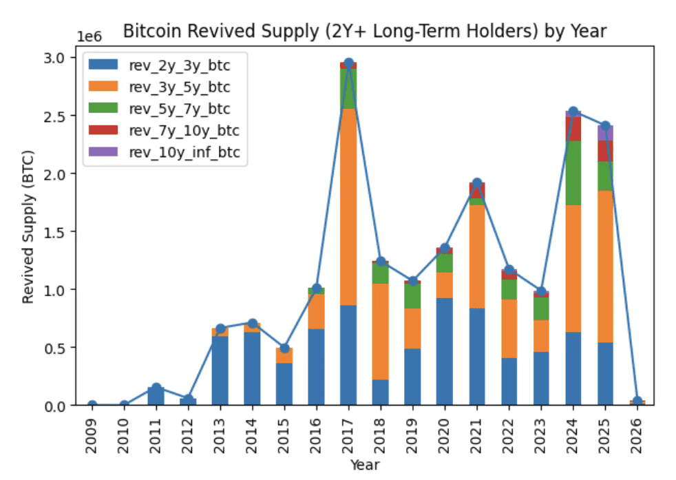 Auch wenn sich der Bitcoin-Kurs noch nicht so verhält, wie viele Anleger hoffen, gibt es auf der Blockchain einige hoffnungsvolle Entwicklungen. Während 2024 und 2025 viele „alte Coins“ wieder in Umlauf gebracht und verkauft wurden, ähnlich wie während der Bullmarkt-Höchststände 2017 und 2021, hat das Jahr 2026 anders begonnen.